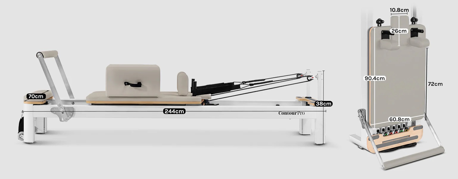 Experience a truly modern, comprehensive workout with the Contour Pro Aluminium Pilates Reformer Machine. Crafted for premium-quality performance, this set features a sleek aluminium frame that combines durability with a modern aesthetic. Experience a transformative full-body workout with its dynamic spring system, while the adjustable components cater to all fitness levels. With smooth gliding and whisper-quiet wheels, the set ensures seamless movement. Redefine your Pilates experience and achieve your fitness goals with this versatile, professional-grade equipment designed for both home use. The Pilates box, jump board & foot strap come included with the bed set.